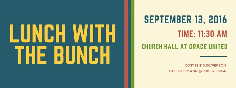 Ladies of the Congregation - it’s that time again! “Lunch with the Bunch” is happening on Tuesday, Sept. 13 @ 11:30 a.m. in the Church Hall at Grace United Church.